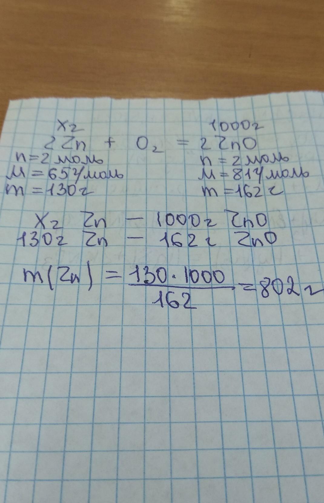 Напишите уравнение реакции взаимодействия цинка с кислородом, укажите её тип. Вычислите массу цинковой пыли, которую нужно сжечь, чтобы получить 1000г оксида цинка.
