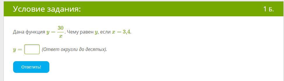 y =  frac{30}{x} \ y =  frac{30}{3.4} = 8.9