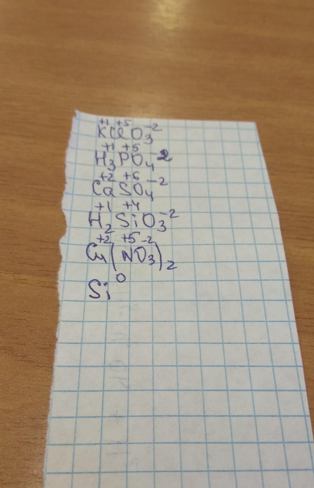 Найдите степень окисления каждого элемента входящего в состав соединений: KClO3, H3PO4 , СаSO4 , H2SiO3, Cu(NO3)2, Si