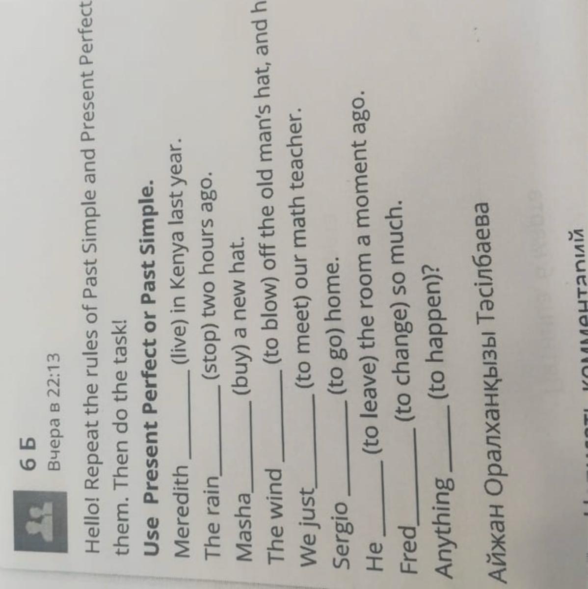 Use present perfect of past simple. Meredith. (live) in Kenya last year