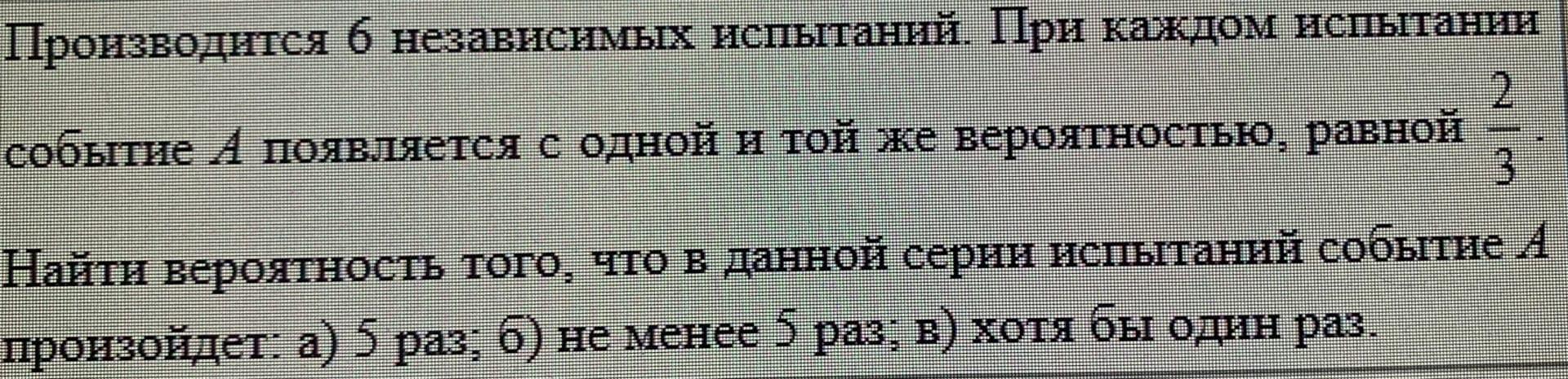 Задача. Производится 6 независимых испытаний. При каждом испытании событие А появляется с одной и той же вероятностью, равной 2/3. Найти вероятность того, что в данной испытаний событие А произойдёт: а) 5 раз; б) не менее 5 раз; в) хотя бы один раз.