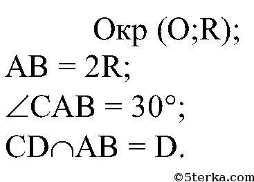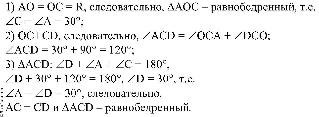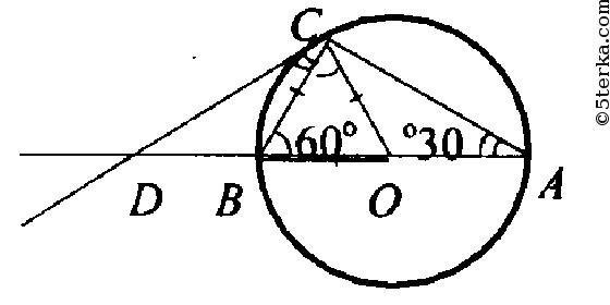 Угол между диаметром АВ и хордой АС равен 30°. Через точку С проведена касательная, пересекающая прямую АВ в точке D. Докажите, что треугольник АСD равнобедренный. Рисунок приложен. Красным помецен угол в 30°. Помогите, пожалуйста.