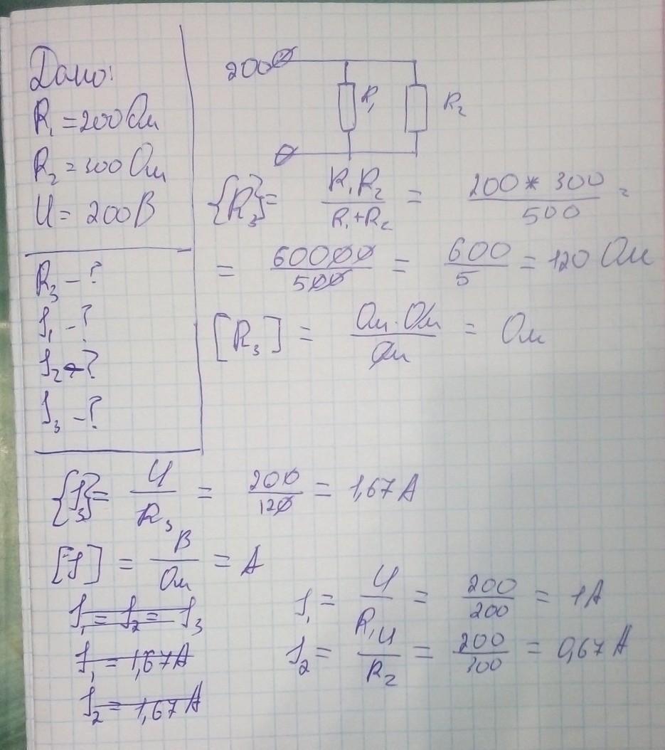 в цепь включены параллельно две лампочки сопротивление которых 300 и 200 ом напряжение в цепи 200 В определить силу тока в каждой лампе, общую силу тока и полное сопротивление