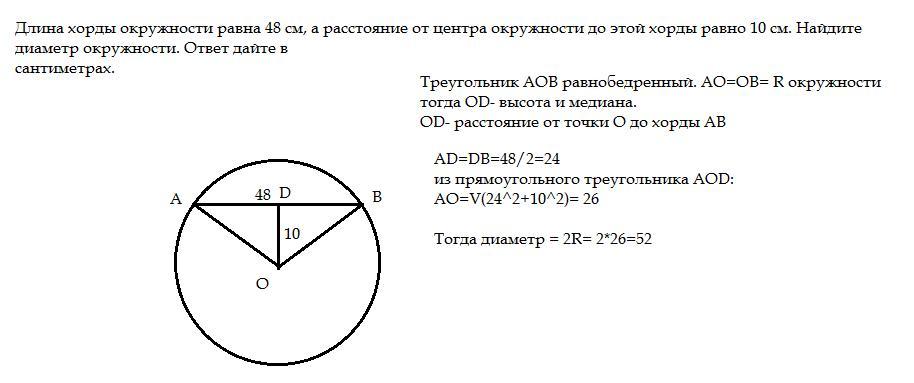 Длина хорды окружности равна 48 см, а расстояние от центра окружности до этой хорды равно 10 см. Найдите диаметр окружности. Ответ дайте в