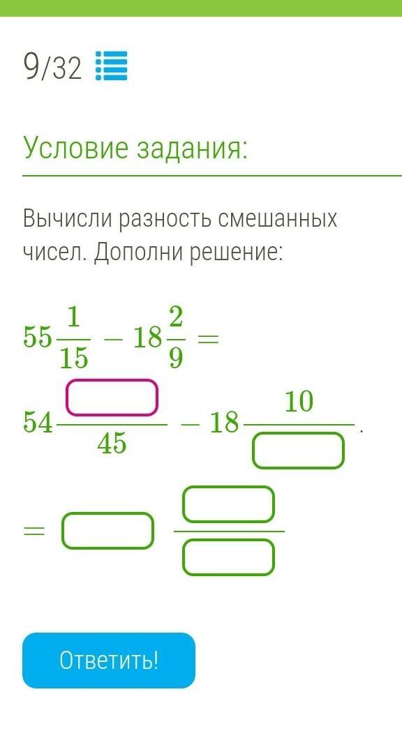 55frac{1}{15} - 18frac{2}{9} = 54frac{3}{45} - 18frac{10}{45} =36frac{38}{45}