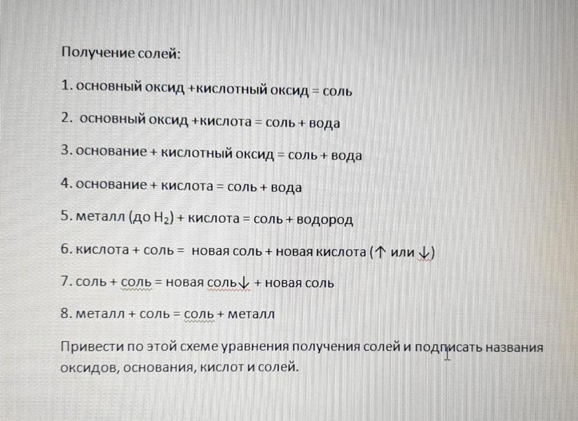 ПРИВЕСТИ ПО ЭТОЙ СХЕМЕ УРАВНЕНИЯ ПОЛУЧЕНИЯ СОЛЕЙ И ПОДПИСАТЬ НАЗВАНИЯ ОКСИДОВ, ОСНОВАНИЯ, КИСЛОТ И СОЛЕЙ