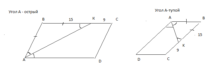 биссектриса угла А параллелограмма АВСД пересекает сторону ВС в точке К. Найдите периметр этого параллелограмма ,если ВК=15 см ,КС=9 см.