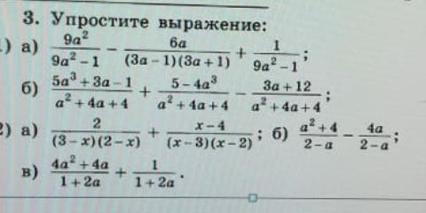 1)\a);frac{9a^2}{9a^2-1}-frac{6a}{(3a-1)(3a+1)}+frac1{9a^2-1}=frac{9a^2}{(3a-1)(3a+1)}-frac{6a}{(3a-1)(3a+1)}+frac1{(3a-1)(3a+1)}=\\=frac{9a^2-6a+1}{(3a-1)(3a+1)}=frac{(3a-1)^2}{{(3a-1)(3a+1)}}=frac{3a-1}{3a+1}\\\b);frac{5a^3+3a-1}{a^2+4a+4}+frac{5-4a^3}{a^2+4a+4}-frac{3a+12}{a^2+4a+4}=frac{5a^3+3a-1+5-4a^3-3a-12}{a^2+4a+4}=frac{a^3-8}{(a+2)^2}