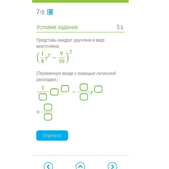 (у⁵/8-9/10)²=(у⁵/8)²-2*(у/8)*(9/10)+(9/10)²=у¹⁰/64-(9/40)у⁵+81/100
