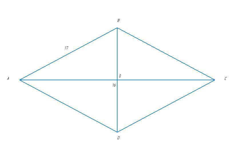 4. Сторона ромба 17см, а його діагональ 16см. Знайдіть іншу діагональ ромба.