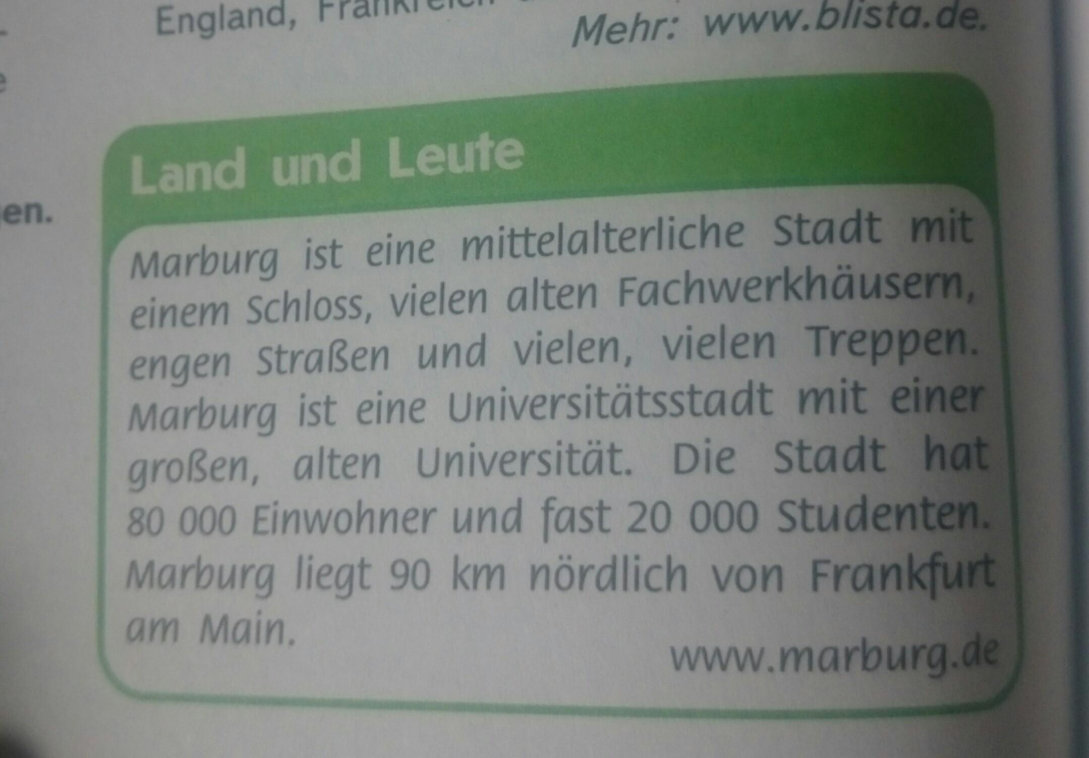Земля и люди Марбург - это средневековый город с замком, множеством старых фахверковых домов, узкими улочками и множеством лестниц. Марбург - университетский город с большим старым университетом. В городе проживает 80 000 жителей и почти 20 000 студентов. Марбург находится в 90 км к северу от Франкфурта-на-Майне, www.marburg.de