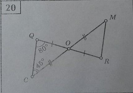 Значит, треугольники равны по двум сторонам и углу между ними. В равных треугольниках против равных сторон лежат равные углы: уголОМR=уголQCO=45°; уголМRO=уголСQO=80°