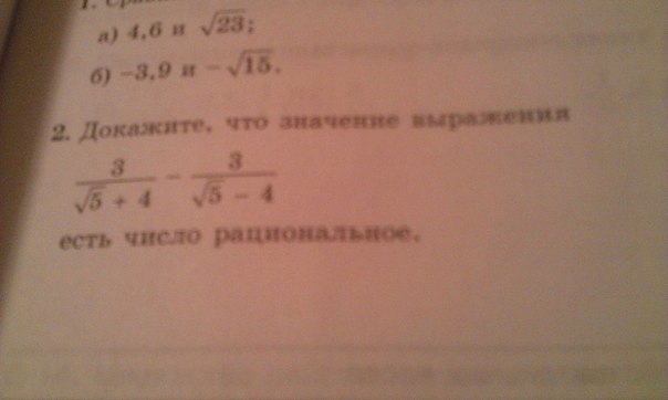 frac{3( sqrt{5}-4)-3( sqrt{5}+4) }{(sqrt{5}+4)(sqrt{5}-4)}= frac{3 sqrt{5}-12-3 sqrt{5}-12 }{5-4 sqrt{5}+4 sqrt{5}-16}= frac{-24}{-11}=frac{24}{11}