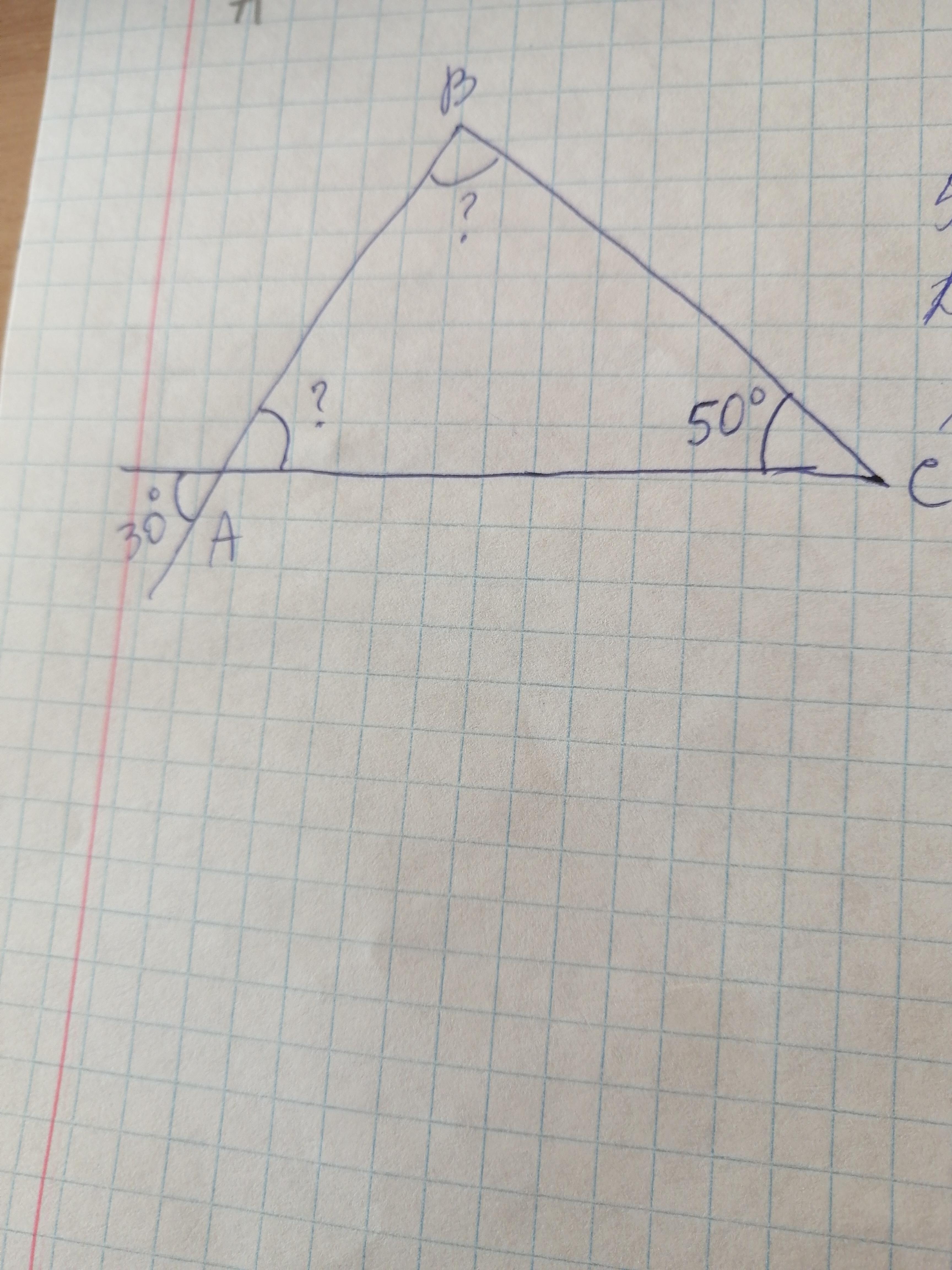 Сумма углов в треугольнике равна 180°: уголВ=180°-30°-50°=100°
