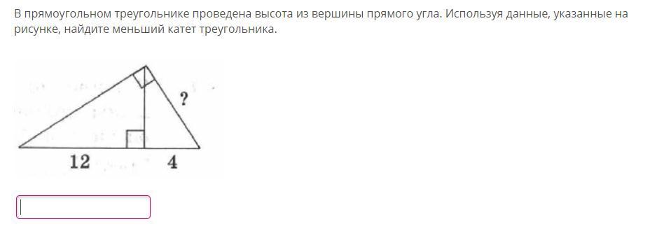 Квадрат катета прямоугольного треугольника равен произведению его проекции на гипотенузу. На данном чертеже проекция неизвестного катета равна 4, а гипотенуза 4+12.