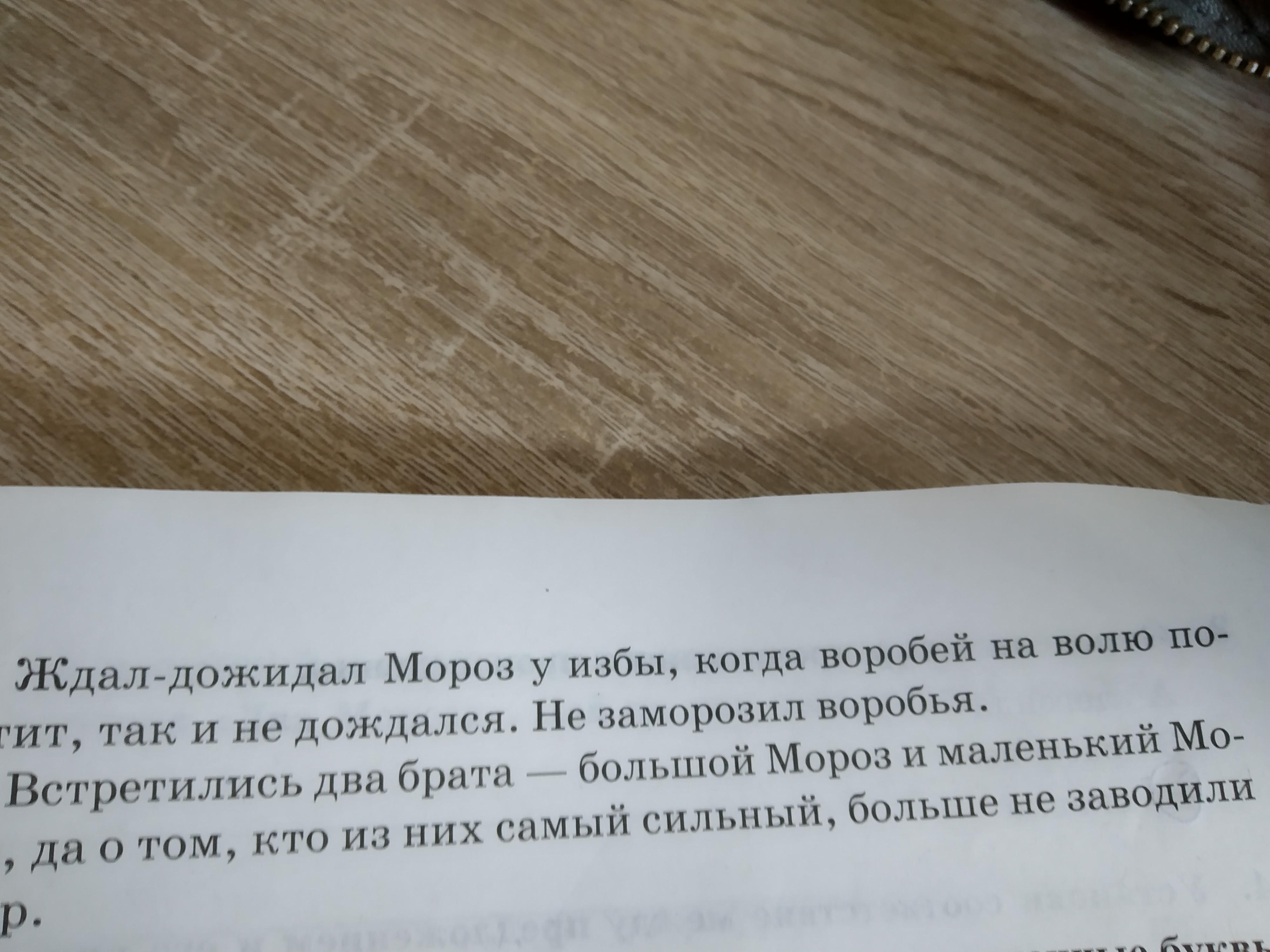 Вид_и_т большой Моро_з_,за_я_ц под кустом с_и_дит.Надумал е_г_о заморозить.Затрещ_а_л,по дерев_ь_ям застуч_а_л.А заяц на слуху.Он косой,маленький, в белой шу_б_ке,в валенках - из-под куста выскочил и помчался на гору бегом, с горы кувырком.