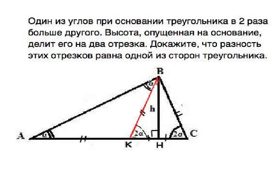 Один из углов при основании треугольника в 2 раза больше другого. Высота, опущенная на основание, делит его на два отрезка. Докажите, что разность этих отрезков равна одной из сторон треугольника.
