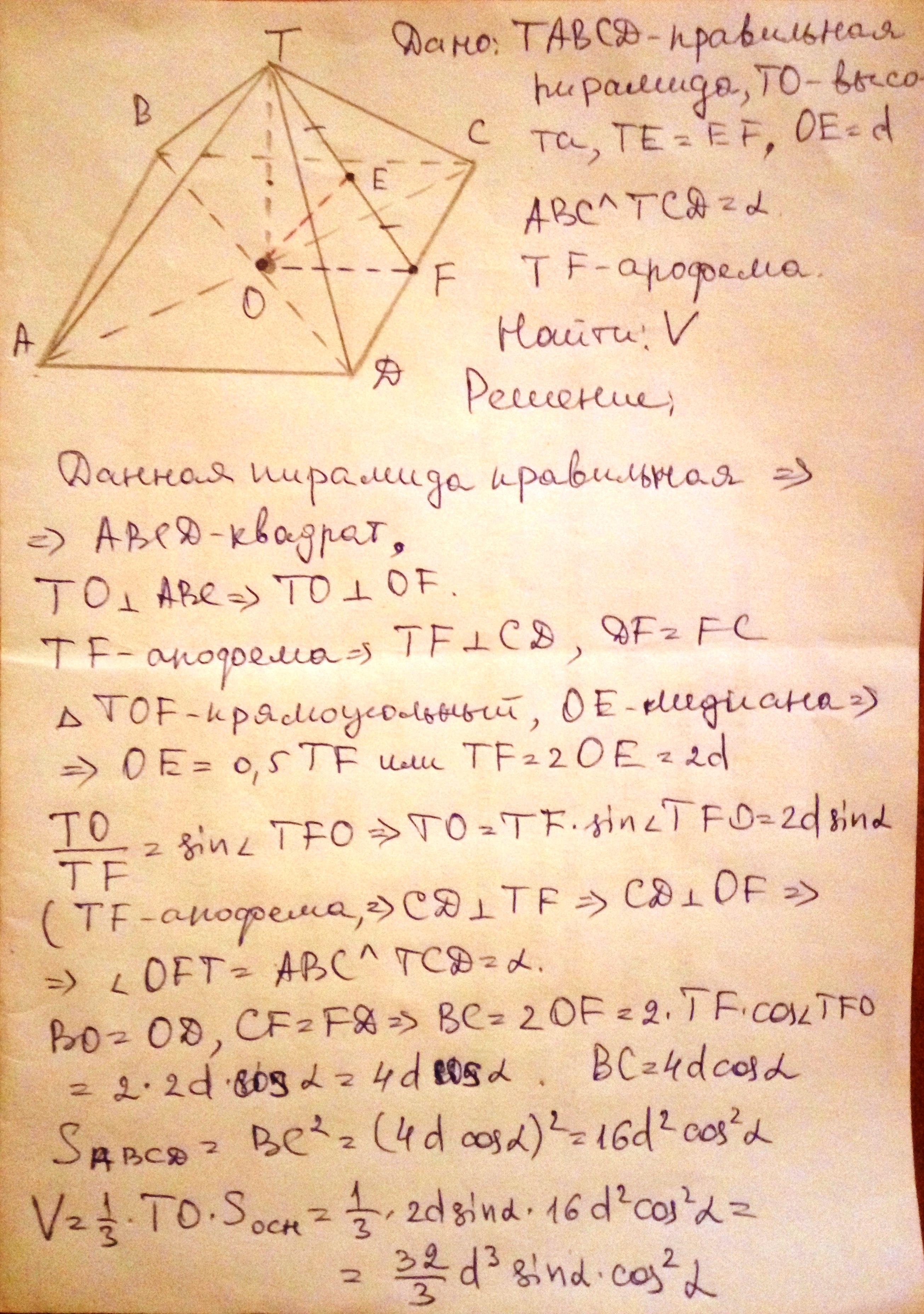 СРОЧНО НАДО!!!! двугранный угол при основании правильной четырехугольной пирамиды равен альфа. найдите объём пирамиды, если расстояние от основания высоты до середины апофемы равно d.