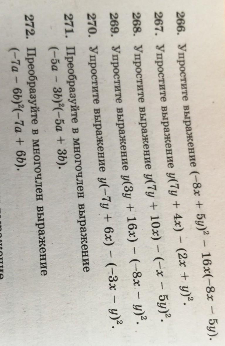 266. (-8х+5у)²-16х(-8х-5у)=(5у-8х)²+128х²+80ху=25у²-80ху+64х²+128х²+80ху=25у²+192х²