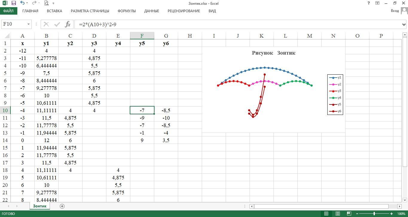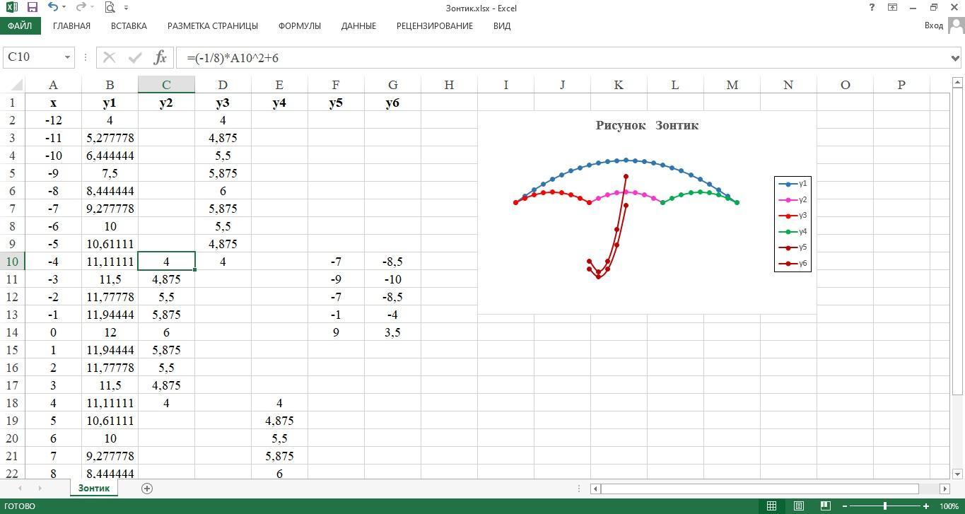 В ячейку С10 вводим формулу =(-1/8)*A10^2+6. Берём за правый нижний уголок, в котором есть маленький зеленый квадратик и тянем вниз до С18.