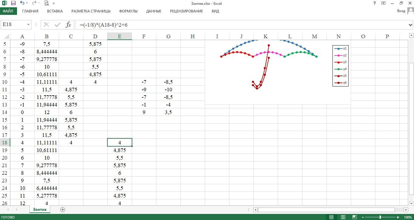 В ячейку Е18 вводим формулу =(-1/8)*(A18-8)^2+6. Берём за правый нижний уголок, в котором есть маленький зеленый квадратик и тянем вниз до Е26.