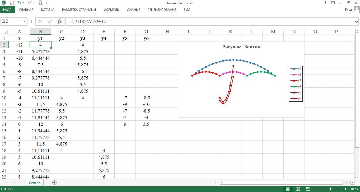 В ячейку В2 вводим формулу =(-1/18)*A2^2+12. Берём за правый нижний уголок, в котором есть маленький зеленый квадратик и тянем вниз до В26.