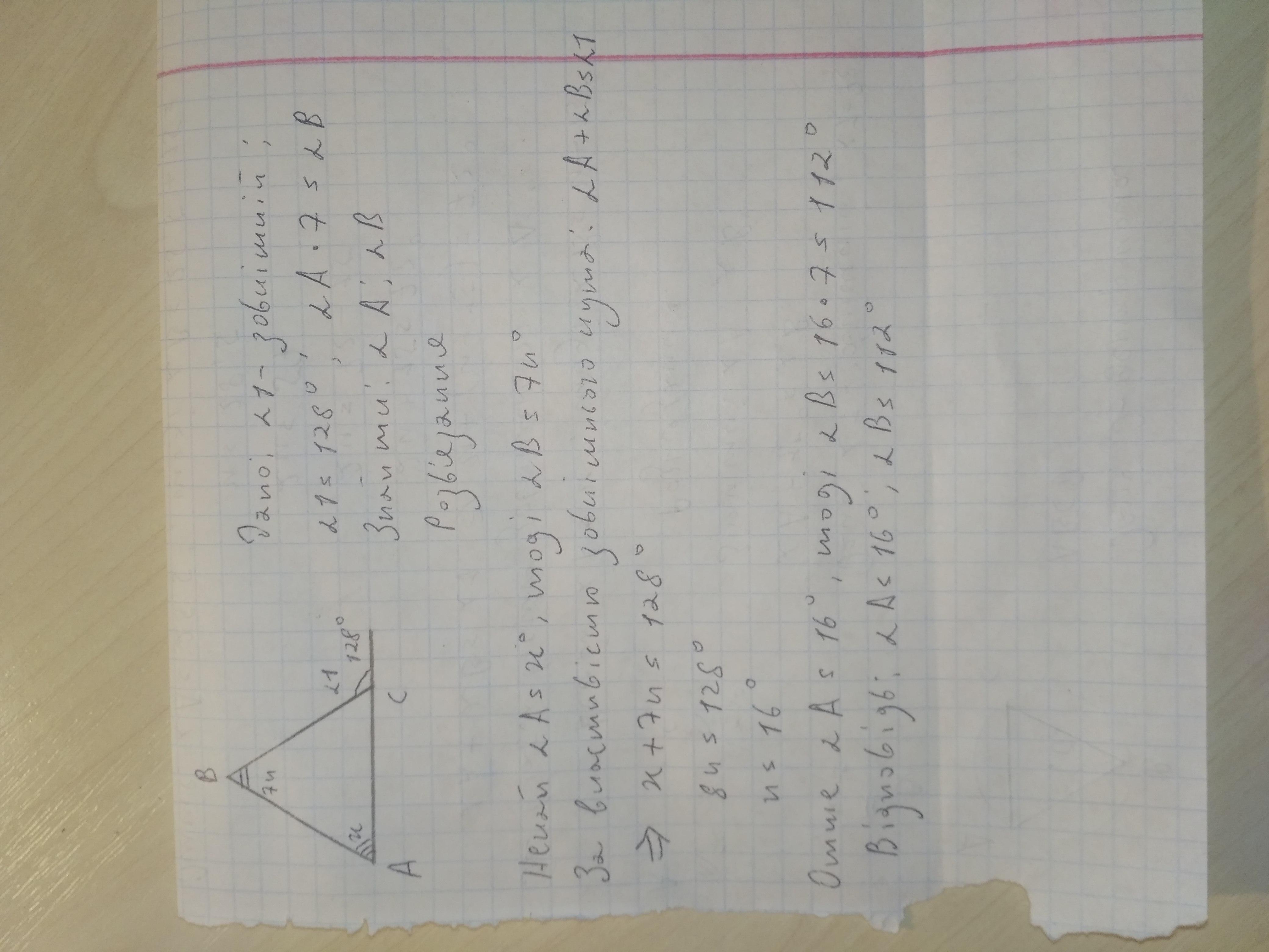 один із зовнішніх кутів трикутника дорівнює 128°.знайдіть кути трикутника, не суміжні з ним, якщо один із них у 7 разів більше за другий