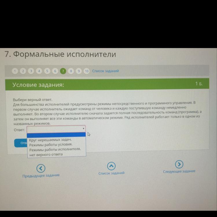 Для большинства исполнителей предусмотрены режимы непосредственного и программного управления. В первом случае исполнитель ожидает команд от человека и каждую поступившую команду немедленно выполняет. Во втором случае исполнителю сначала задаётся полная последовательность команд (программа), а затем он выполняет все эти команды в автоматическом режиме. Ряд исполнителей работает только в одном из названных режимов. - РЕЖИМЫ РАБОТЫ ИСПОЛНИТЕЛЯ.