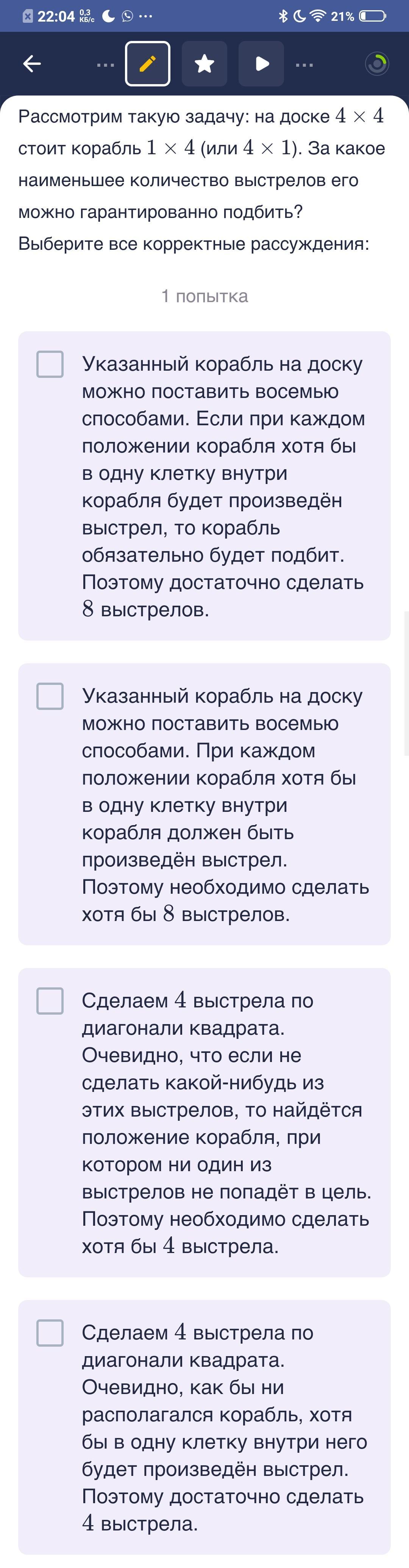 Рассмотрим такую задачу: на доске 4×4 стоит корабль 1×4 (или 4×1). За какое наименьшее количество выстрелов его можно гарантированно подбить? Выберите все корректные рассуждения: