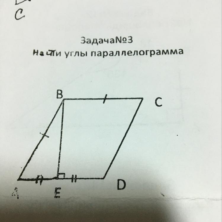 Если провести диагональ BD, то, при условии, что ВЕ перпендикулярно АЕ, становится очевидно, что получившиеся треугольники ABD и BCD равносторонние. Значит, сторона AD равна AB, и АЕ, соотсетственно, равно половине АВ. Отсюда, угол напротив катета АЕ прямоугольного треугольника АВЕ равен 30°. Все остальные углы рассчитываются элементарно.