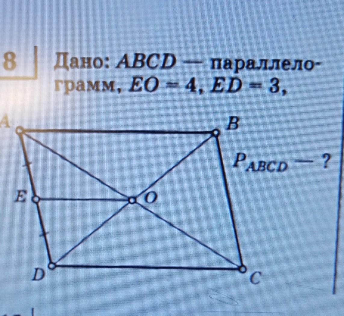 Теперь посмотри на отрезок ЕО и продли его до ВС. Ты нарисовал/а среднюю линию параллелограмма. Из этого следует,что вся линия будет равна 8 см. Запомни,что в точке пересечения диагоналей параллелограмма его средние линии делятся пополам(нам учительница по геоме рассказывала). Из этого выходит,что АН=НВ=4, а вся сторона параллелограмма будет равна 8.
