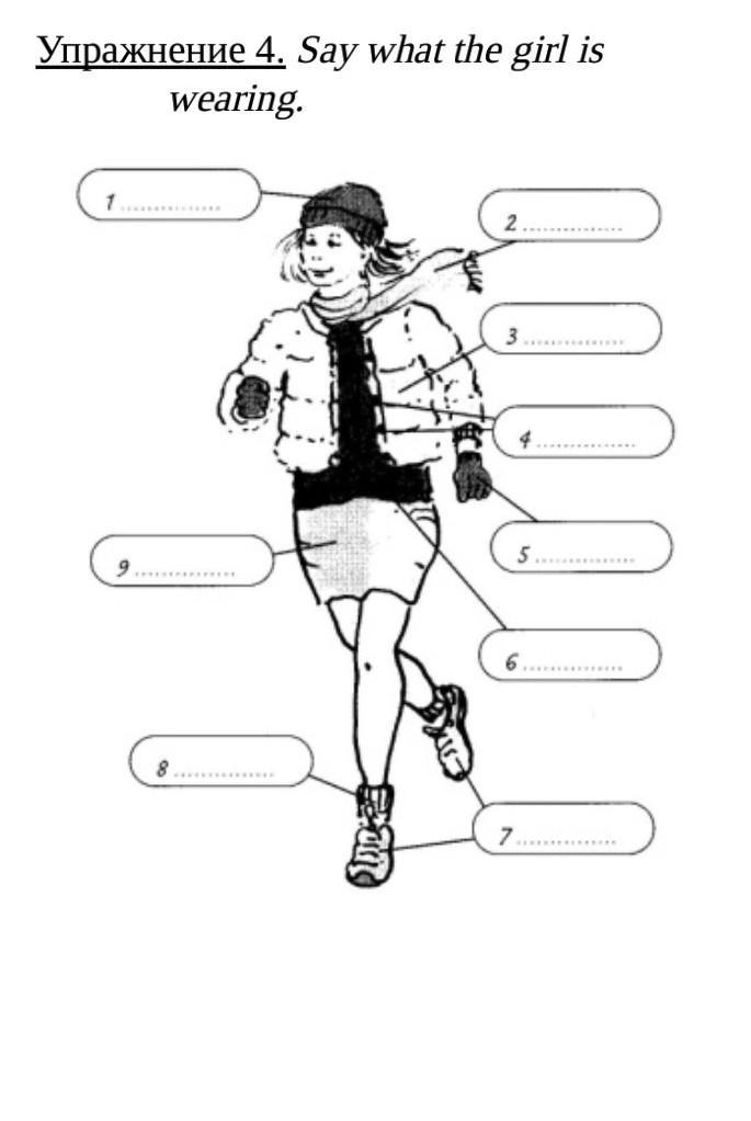1 hat 2scarf 3 jacket 4 buttons 5 gloves 6 blouse 7 boots 8 socks 9 skirt