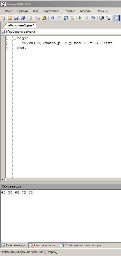 дан ряд натуральных чисел от 40 до 90. Вывести на экран только те числа этого ряда, которые оканчиваются на 8