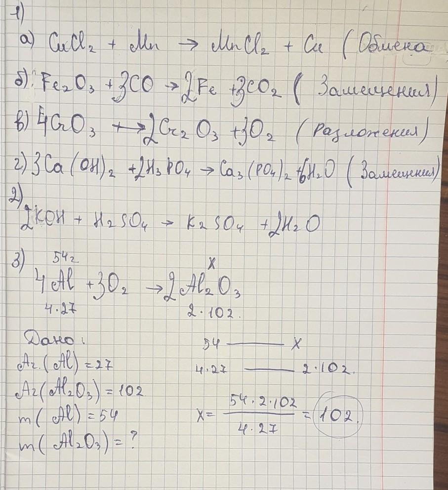 1) Расставьте коэффициенты в уравнениях химических реакций, укажите тип реакции