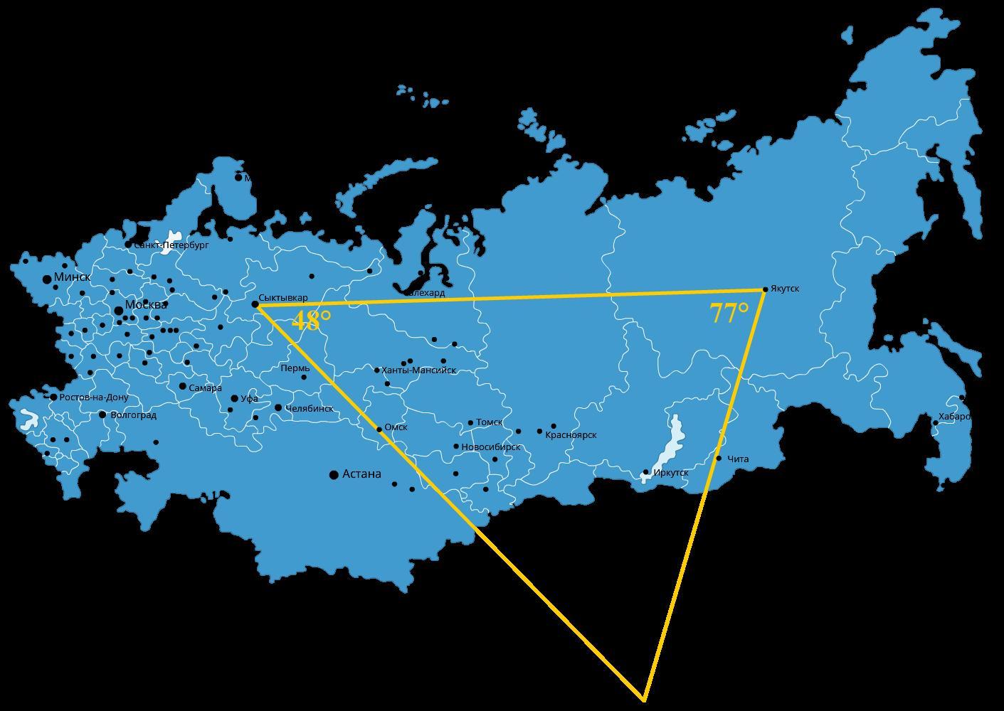 Вычислите угол между прямыми, проходящими через города Сыктывкар, Омск и Якутск, Чита.