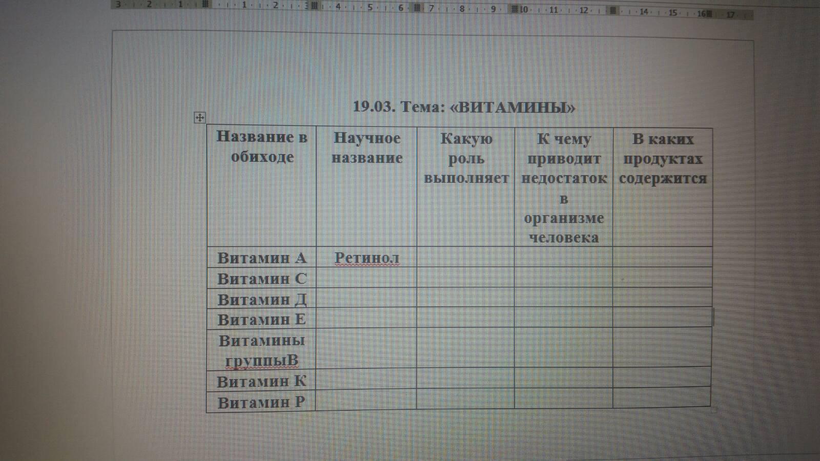 Витамин D - -------; регулирует обмен кальция и фосфора; при недостатке в детском возрасте развивается рахит (нарушение процесса костеобразования); Источник: рыбий жир, яичный желток, печень, образуется в коже под влиянием ультрафиолетовых лучей