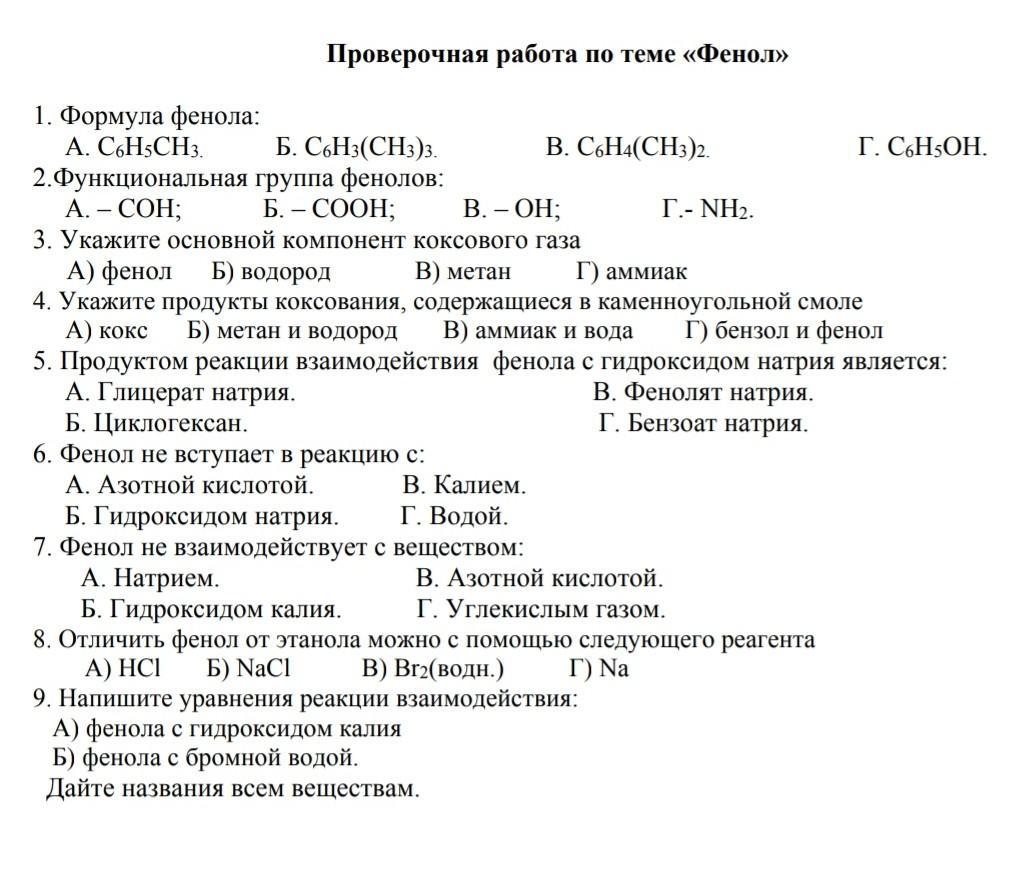 1.г,2.в,3. 4. ,5.г,6.б,7.г,8.в,9.б C6H5OH+3Br2--3HBr+C6H5Br3