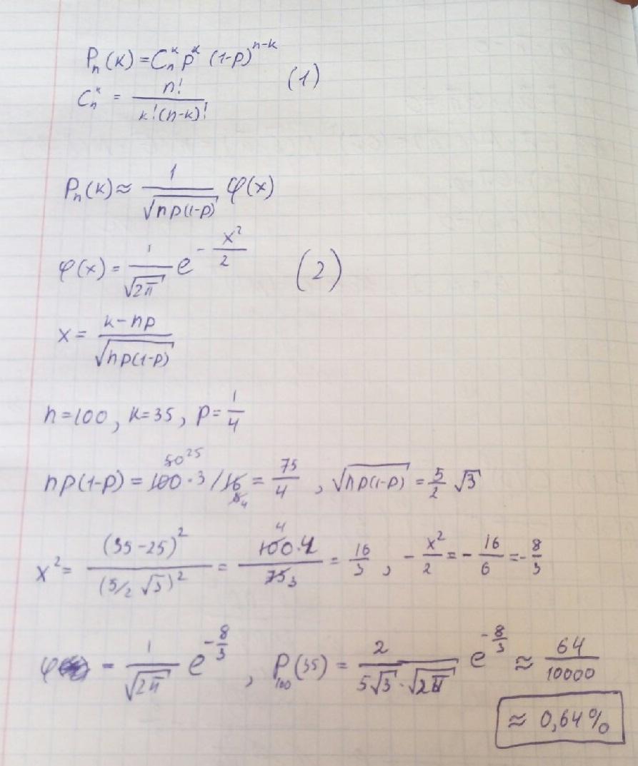 Эта задача решается с помощью формулы Бернулли формула (1) на фотке. Но для больших чисел получить результат в виде десятичной дроби крайне затруднительно из-за факториалов. Используем приближение Лапласа для формулы (1) - формулы (2). Просто подставляем числа, высчитываем на калькуляторе некоторые формулы по типу экспоненты и корня и получаем в итоге приблизительно , они же 0.64%.