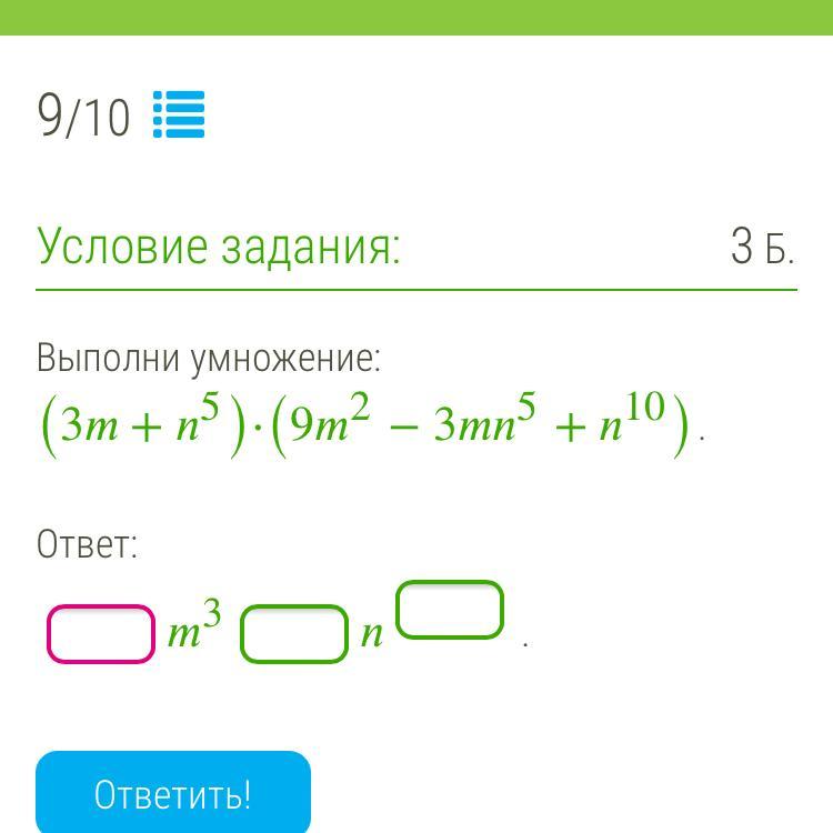 (3m + n⁵)(9m² - 3mn⁵ + n¹⁰) = (3m)³ + (n⁵)³ = 27m³ + n¹⁵