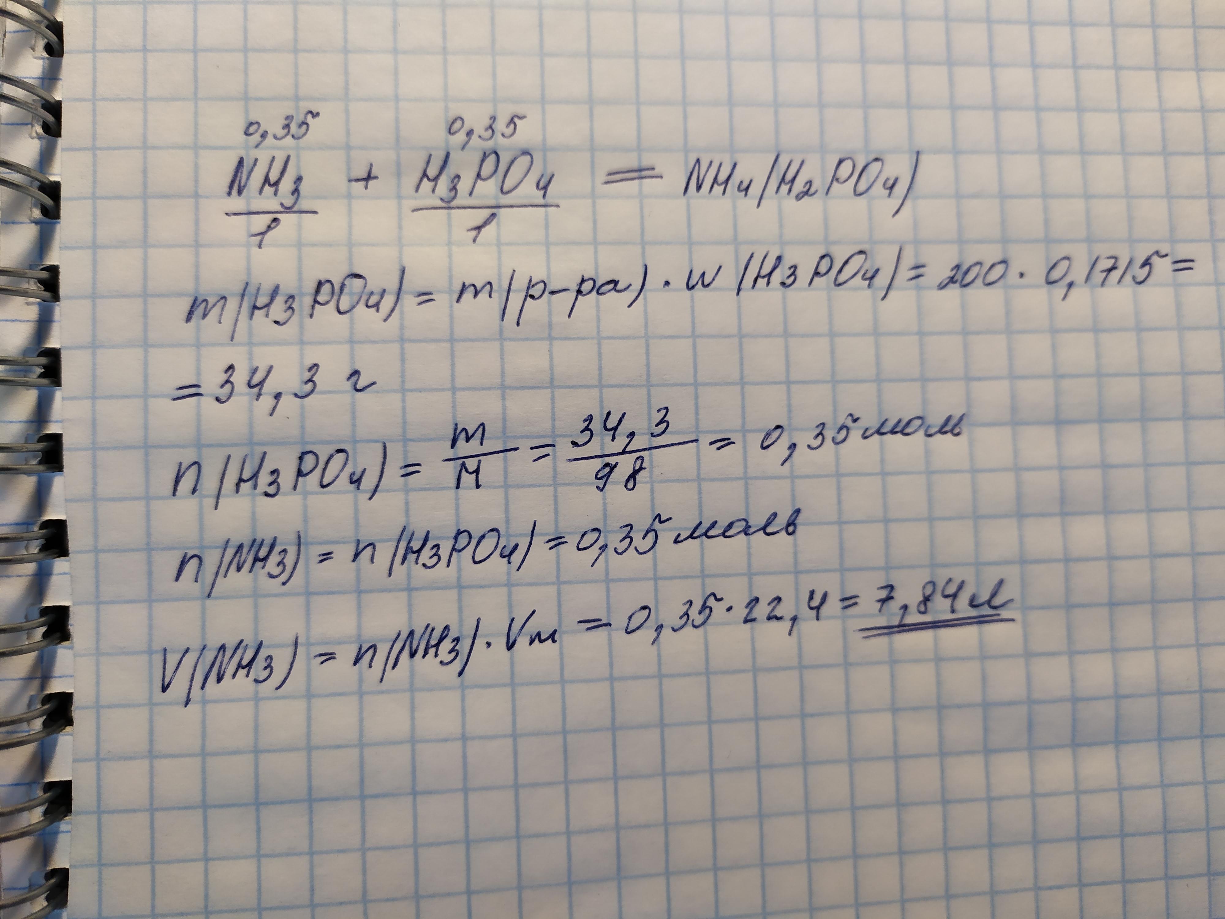 Определите и укажите, какой объем аммиака (л; до сотых) (н. у.) поглотил раствор ортофосфатной кислоты, масса которого составляет 200 г, а массовая доля кислоты— 17,15%, если в полученном растворе обнаружили лишь аммоний дигидрогенфосфат.