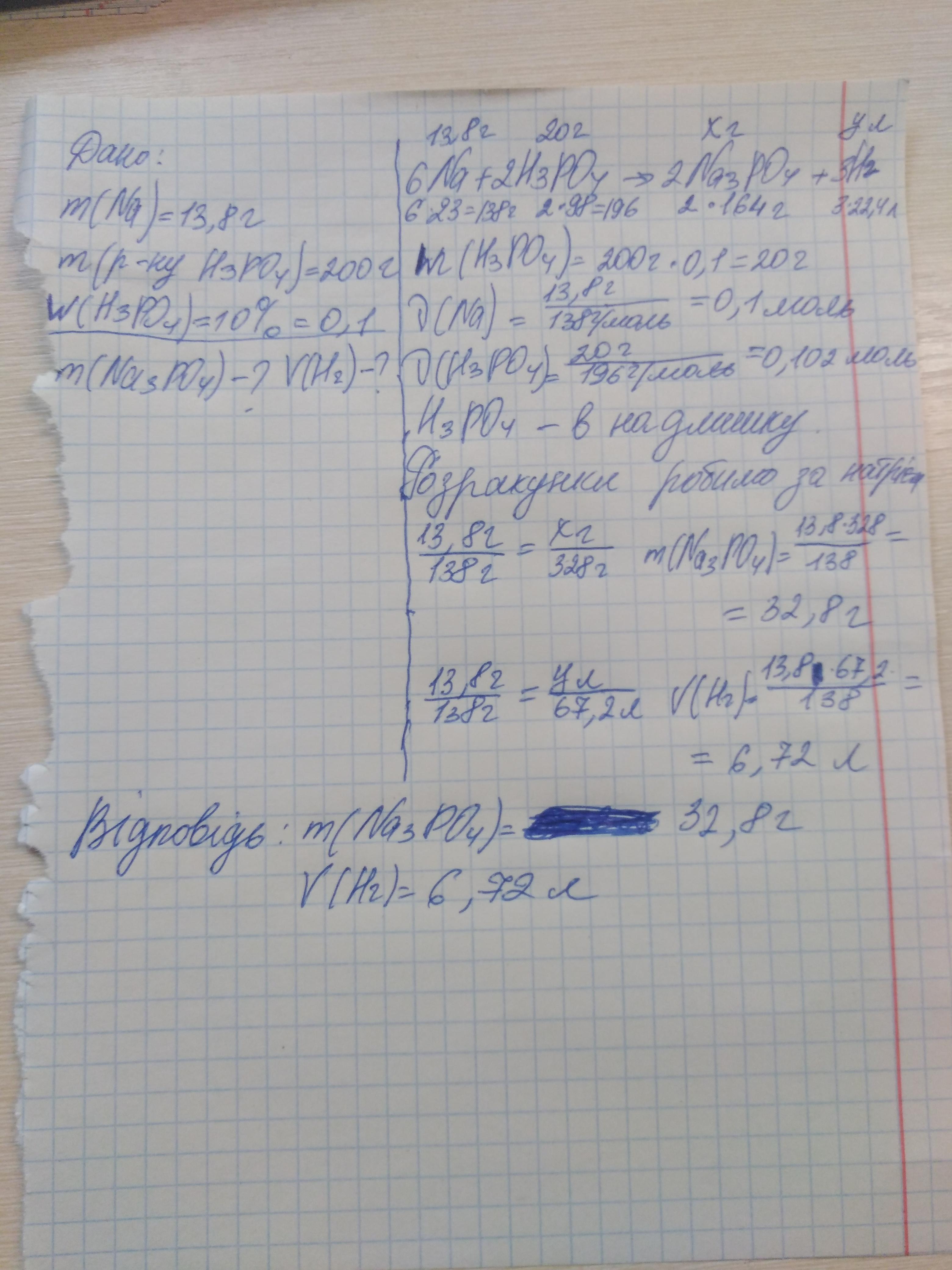 Химия!знайдіть масу солі та об'єм газу, що утвориться під час взаємодії 13,8 г натрію та 200 г розчину ортофосфатної кислоти з масовою часткою розчиненої речовини 10 %.