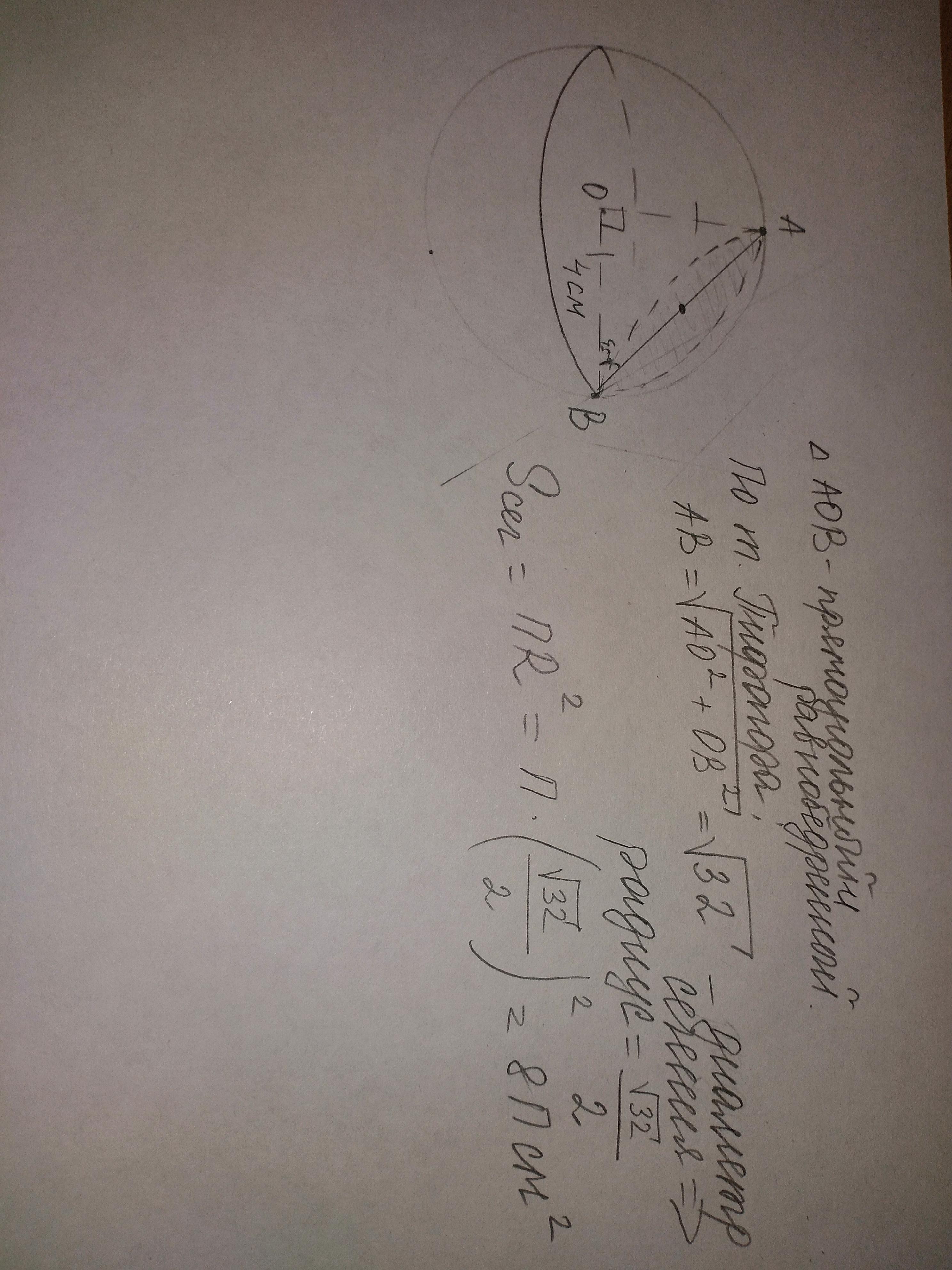 Радиус шара равен 4 см, через конец радиуса, лежащего на сфере, проведена плоскость под углом 45° к радиусу. Найдите площадь сечения шара этой плоскостью.