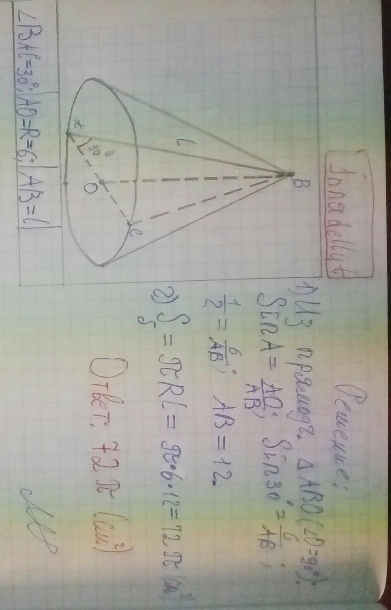 Образующая конуса наклонена к плоскости основания под углом 30° , а радиус окружности, описанной около осевого сечения конуса, равен 6 см. Найдите площадь боковой поверхности конуса.