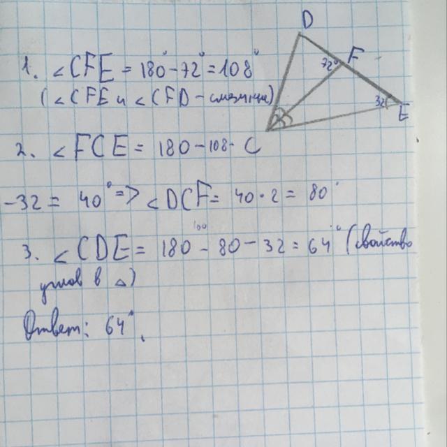 В треугольнике CDE с углом E , равным 32° , проведена биссектриса CF , угол CFD=72°. Найдите угол CDE