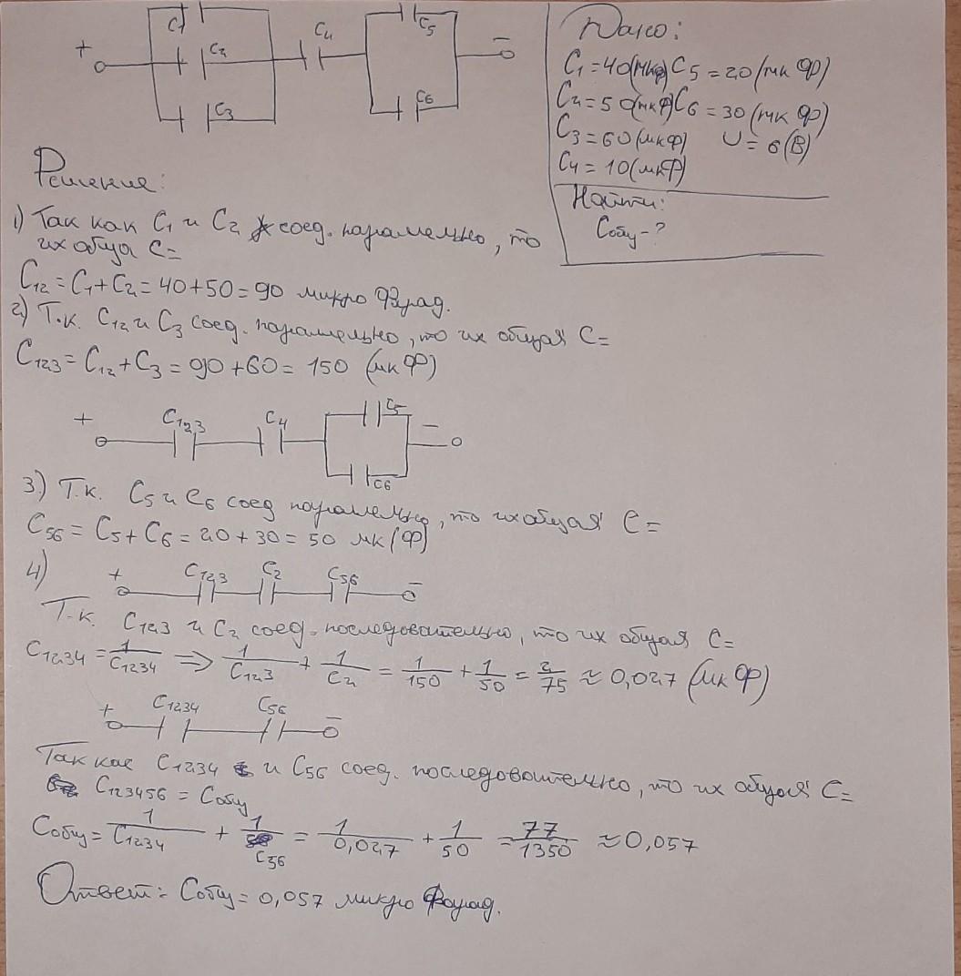 Держи)) только немогу понять, зачем в задаче указано напряжение? Либо ты написал(а) не всё задание?(что скорее всего и вероятно). Исходя из данных я только мог найти общую электроёмкость "С".