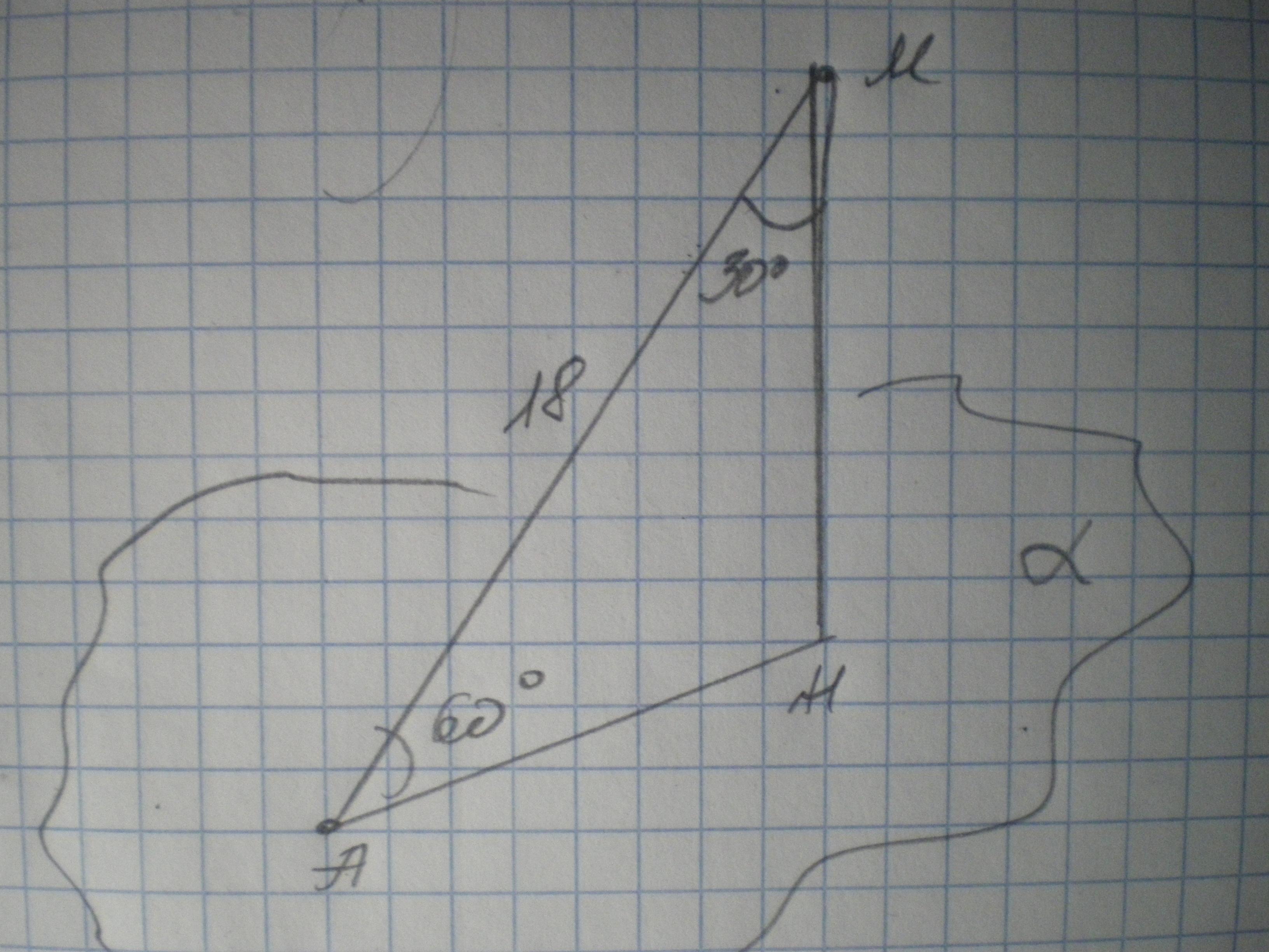 Дано: площина α; МН⊥α; МА=18 см, ∠МАН=60°. Знайти МН.