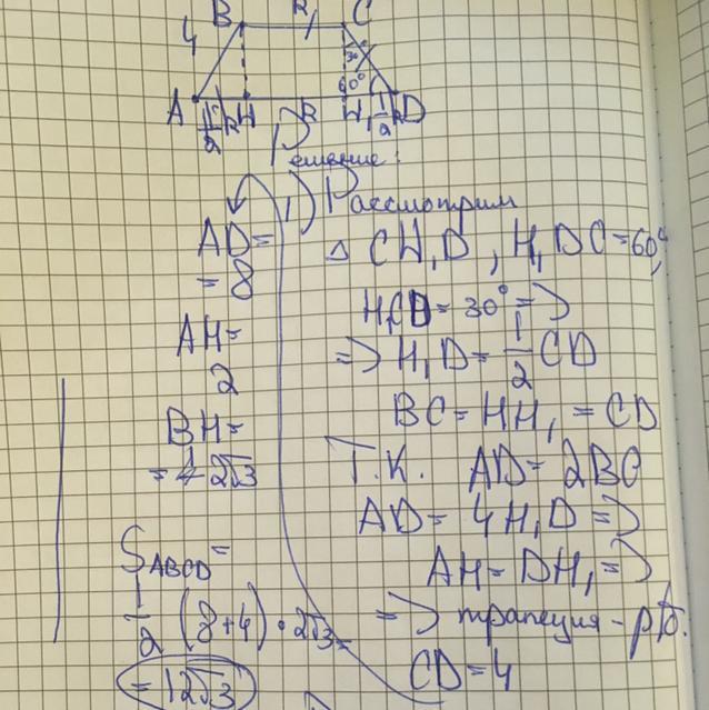 в трапеции abcd основание ad в два раза больше основания bc и вдвое больше боковой стороны cd.Угол ad равен 60 ,сторона ab равна 4 .Найти площадь трапеции.