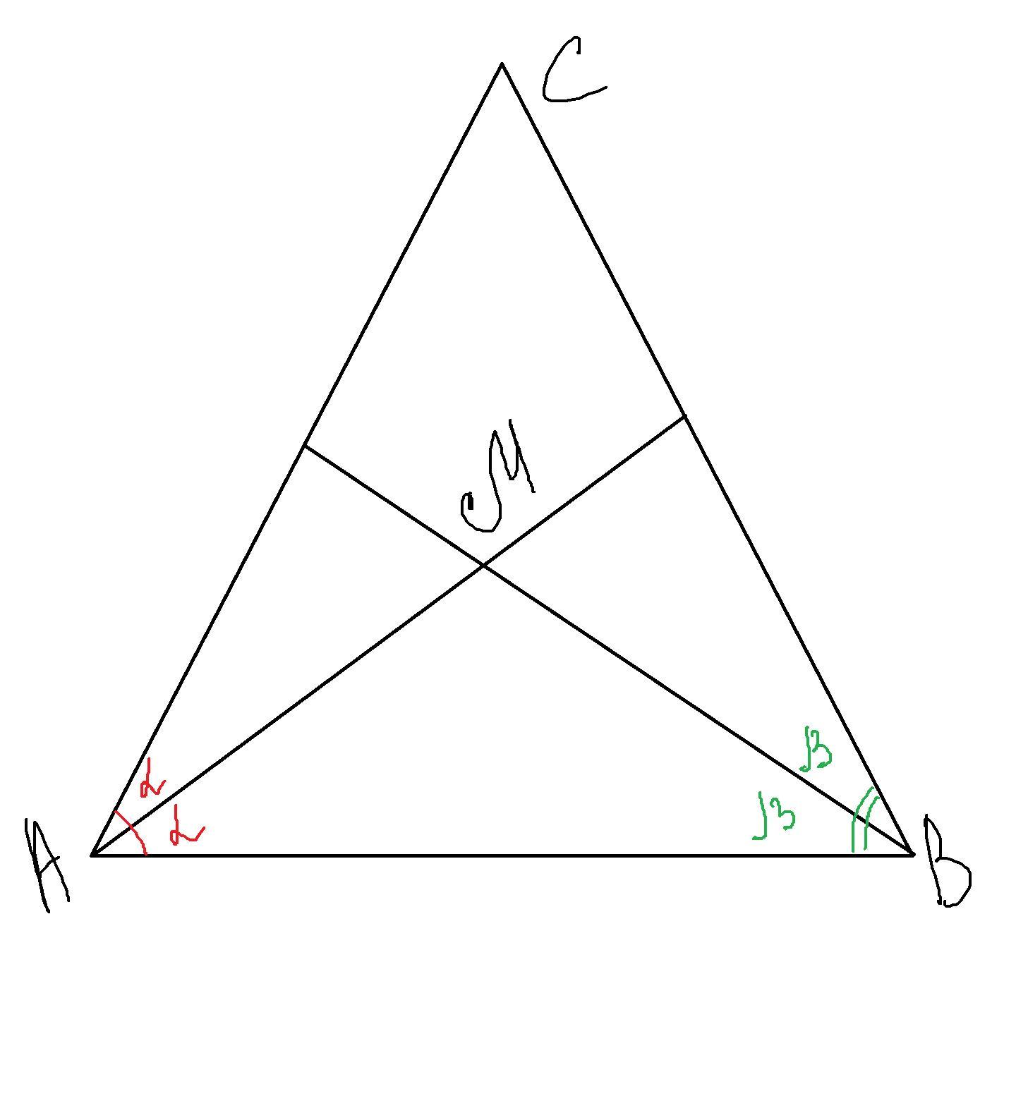 Т.к. у нас есть биссектрисы угла А и В, то обозначим углы, на которые их разделили α и β соответственно