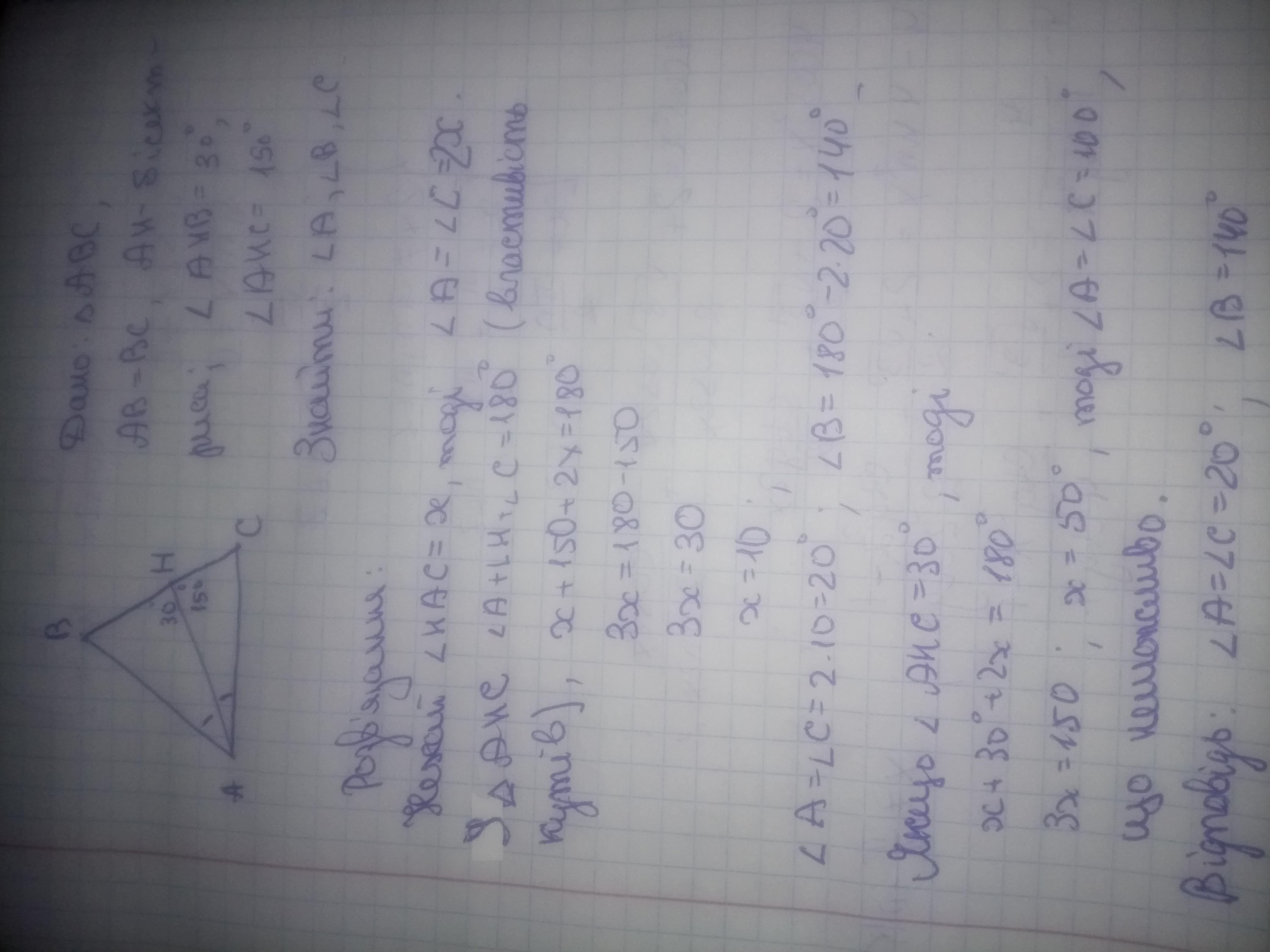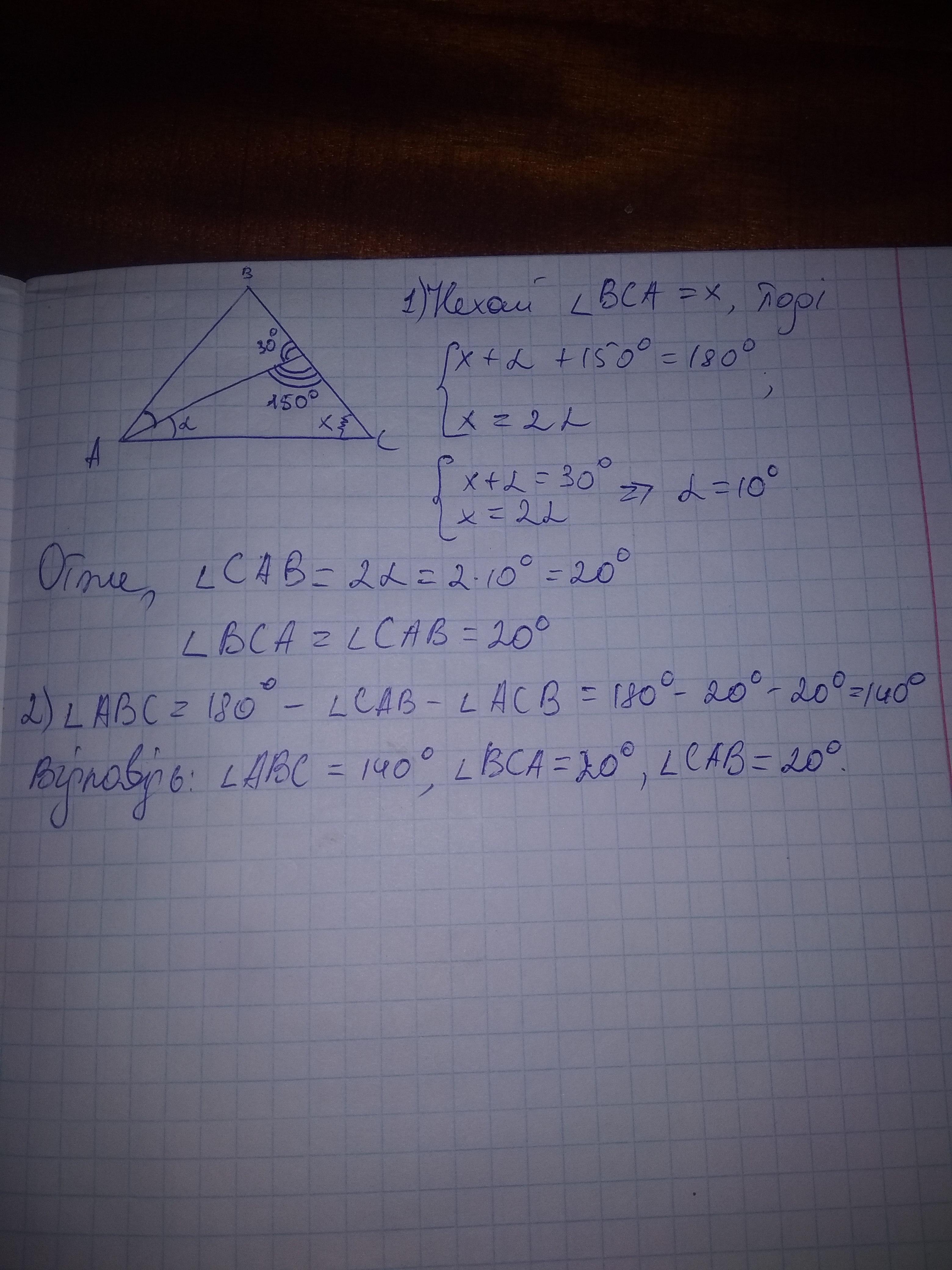 Бісектриса рівнобедреного трикутника, проведена з вершини при основі, утворює з протилежною стороною кути, що дорівнюють 30⁰ і 150⁰. Знайти кути даного рівнобедреного трикутника. срочно дам 100 б