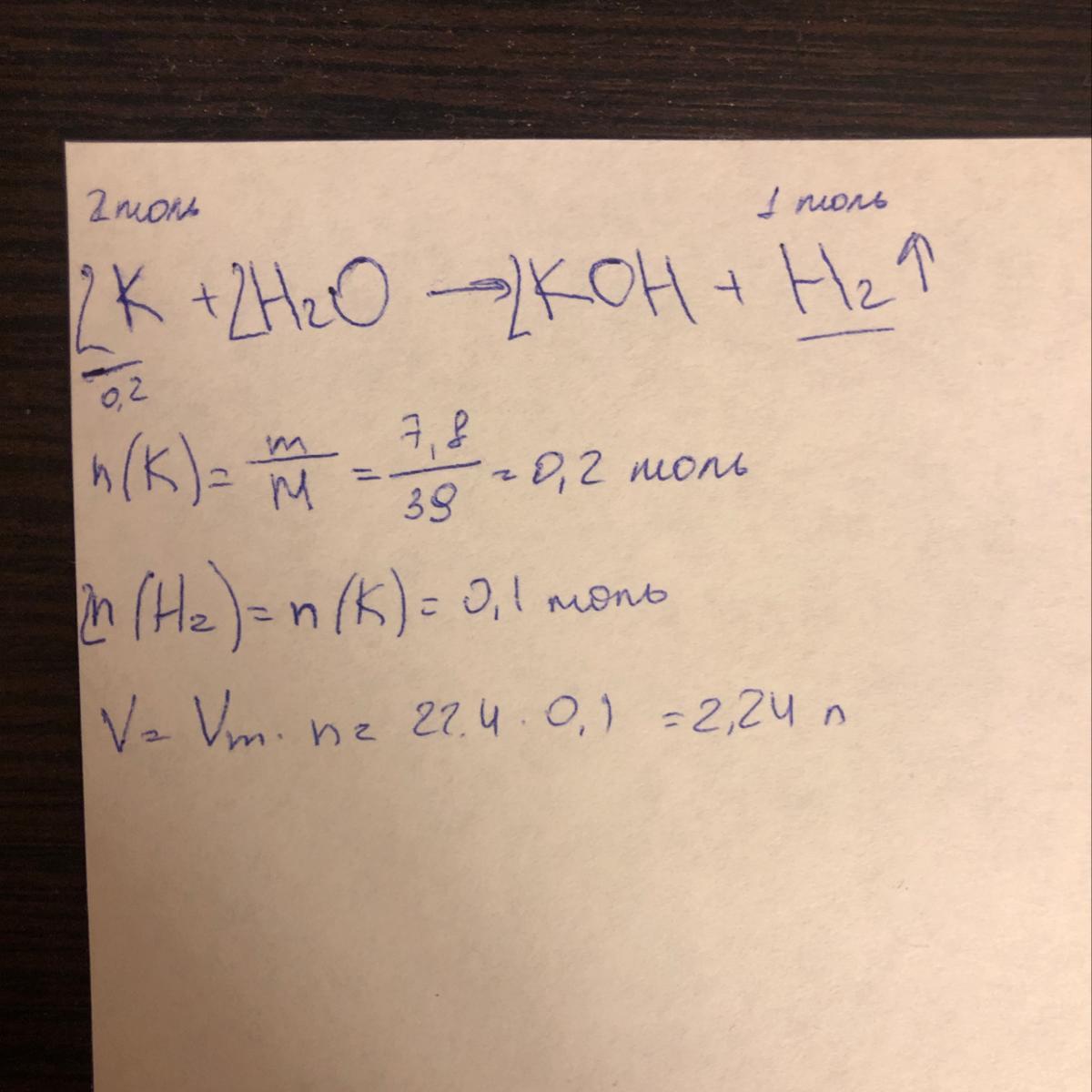 Кусочек калия массой 7,8 г опустили в химический стакан с водой. Вычислите объем выделившегося водорода (н.у.).